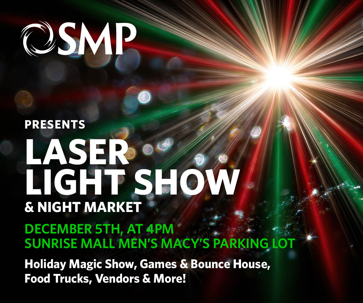 Laser Light Show and Night Market at Sunrise Marketplace Sunrise Marketplace returns with a kick-off celebration you won’t want to miss! For one night only, Friday, December 5, starting at 4 PM, the parking at Sunrise Mall in Citrus Heights will transform into a holiday rockin’ spectacular and night market. ✨ Don’t miss the magical
